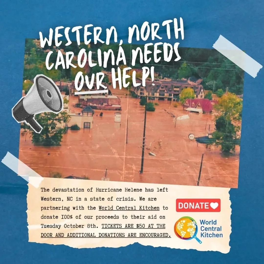 As such, we are supporting World Central Kitchen by hosting an Evening of Charity Dinner on October 8th from 5PM-9PM. Outside of helping our friends in Western NC, 100% of ticket sales will be donated to supply aid to those impacted by the devastation of Hurricane Helene.