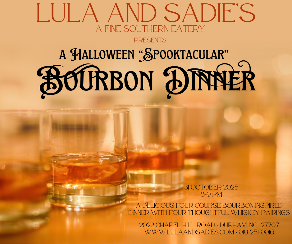 🥃 Lula and Sadie’s is having a ONE OF A KIND Bourbon inspired evening under the stars! Join us on Friday October 31st from 6-9PM for our very first “SPOOKTACULAR” Bourbon Pairing Dinner.