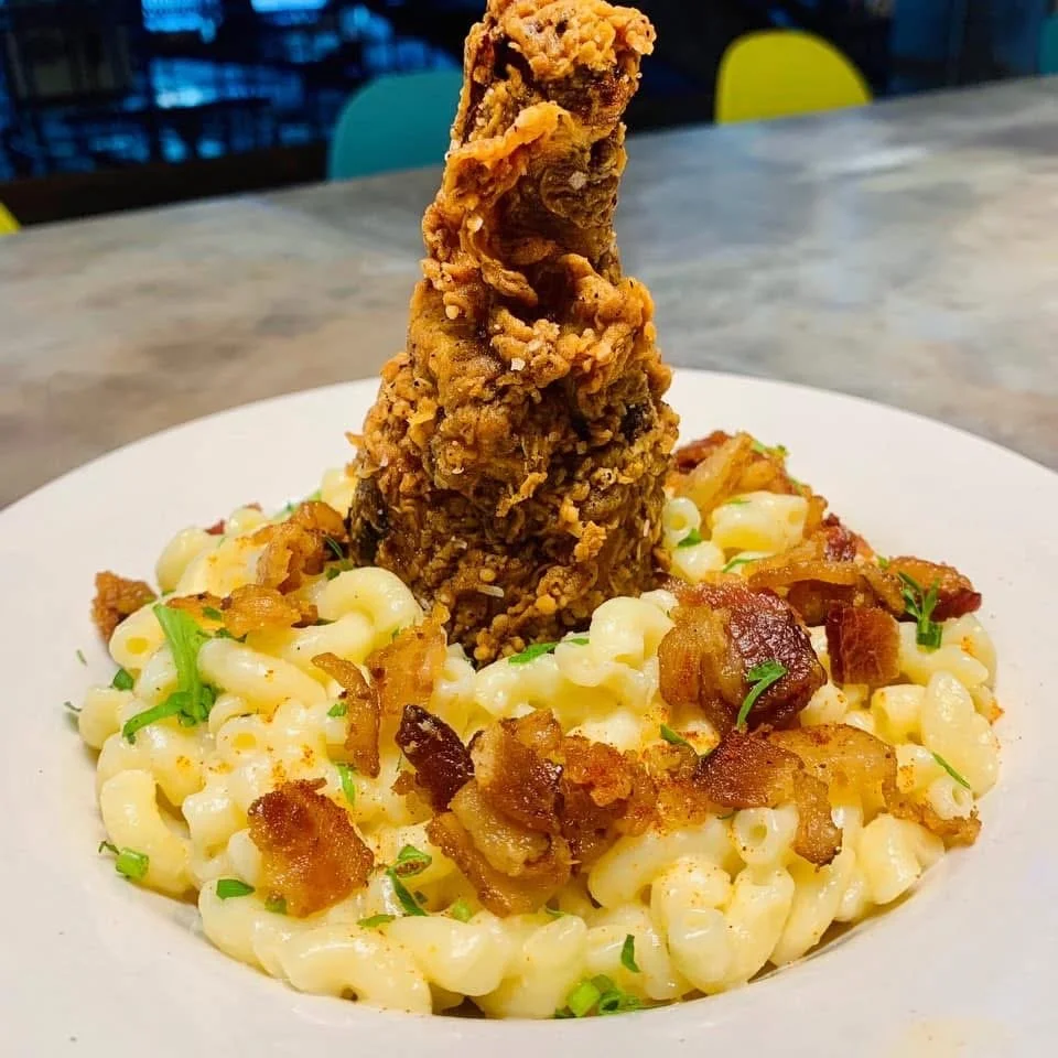 Our White Mac-N-Cheese with Two Crispy Fried Lollipop Chicken Drumsticks, Crumbled Bacon and Your Choice of Our “Mild, Hot or Hottest” Hot Sauce.