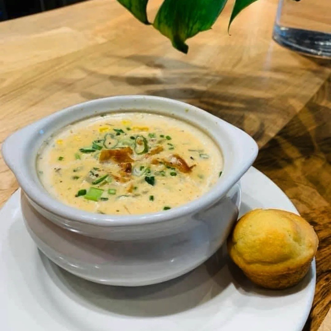 A Creamy Soup with Dawnbreaker Farms Turkey (Hurdle Mills, NC), Corn, Yukon Gold Potatoes, Vidalia Onions and English Peas.